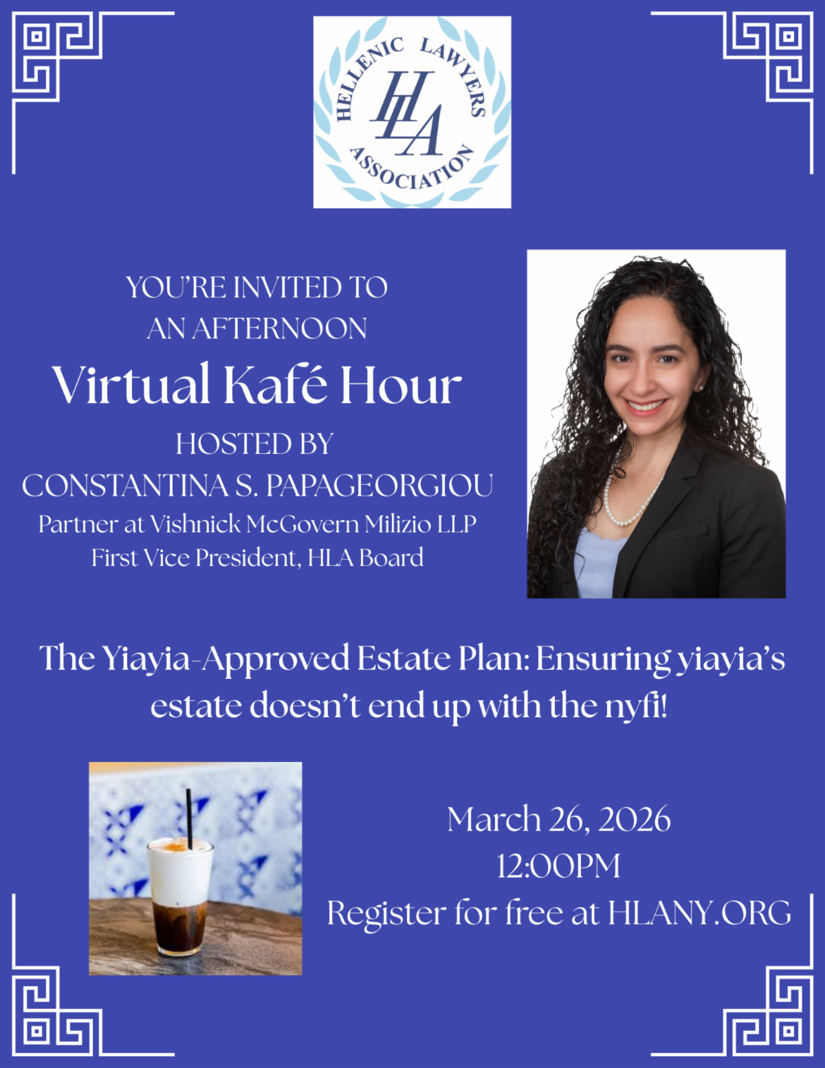 You're Invited! VMM partner Constantina Papageorgiou and the Hellenic Lawyers Association invite you to a Kafé Hour virtual talk about estate planning.