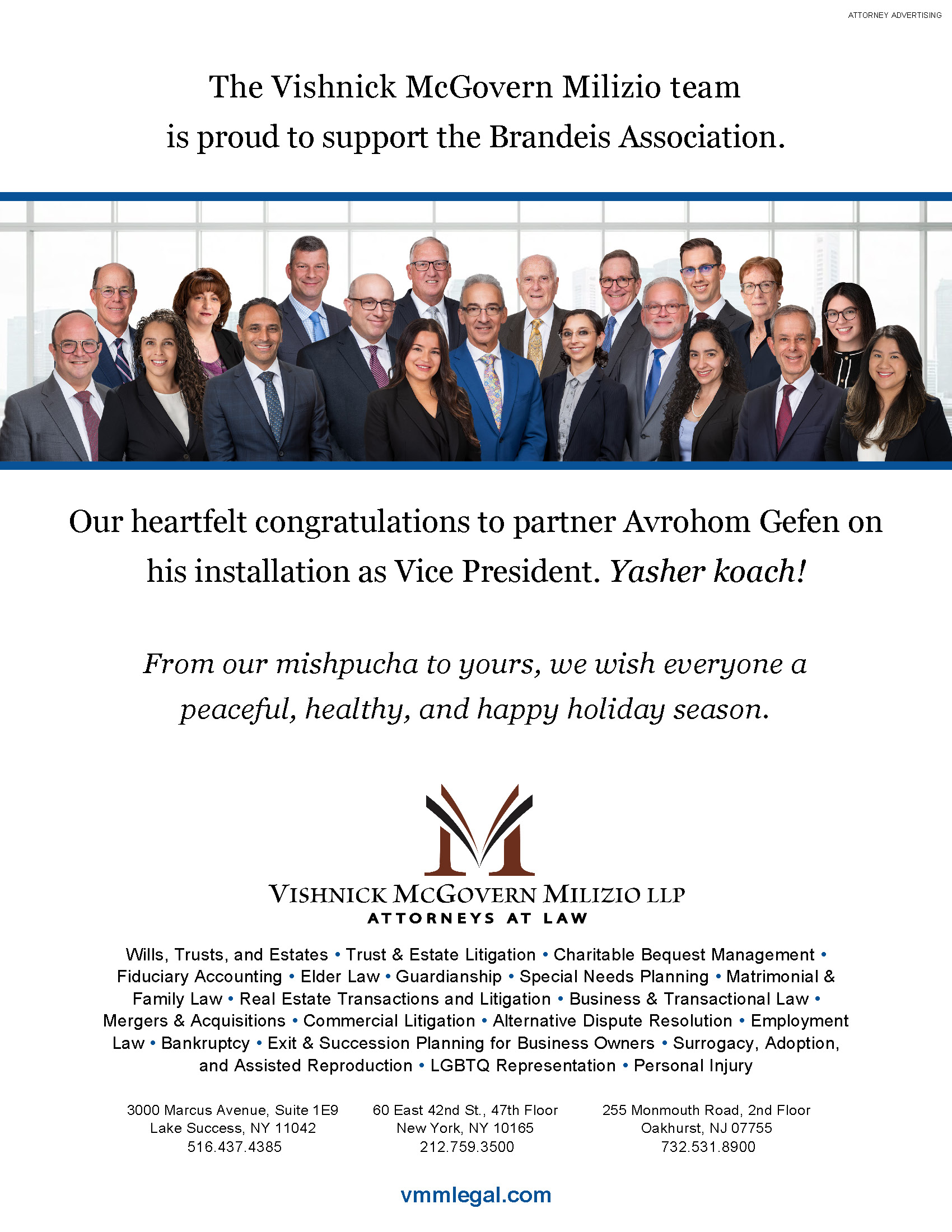 VMM is proud to congratulate partner Avrohom Gefen, head of the firm's Employment Law and Commercial Litigation practices, on his installation as Vice President of the Brandeis Association, a Queens County Bar Association of Jewish Legal Professionals.