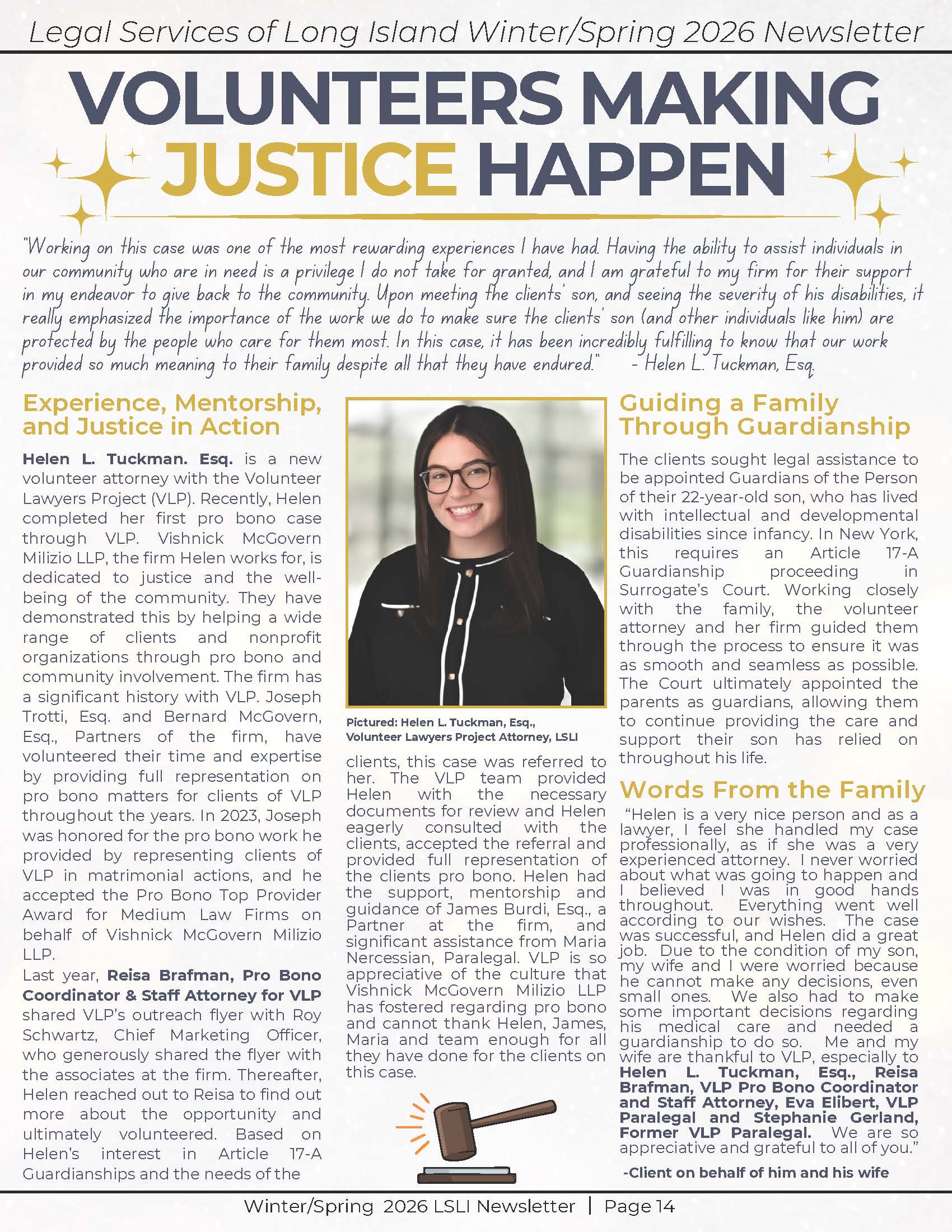 For her exceptional dedication and volunteerism, Ms. Tuckman was featured in the Legal Services of Long Island Winter/Spring 2026 newsletter, published April 21, 2026. It can be found on page 14 here and below.