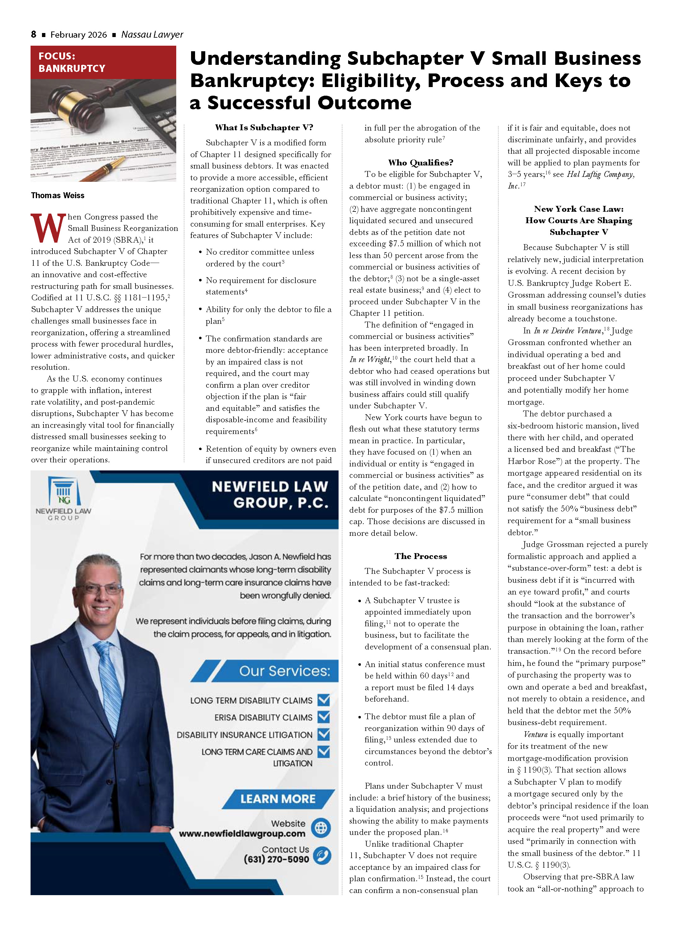Partner Thomas Weiss, head of VMM’s Bankruptcy practice, was invited by Nassau Lawyer to write an article on "Understanding Subchapter V Small Business Bankruptcy: Eligibility, Process and Keys to a Successful Outcome."